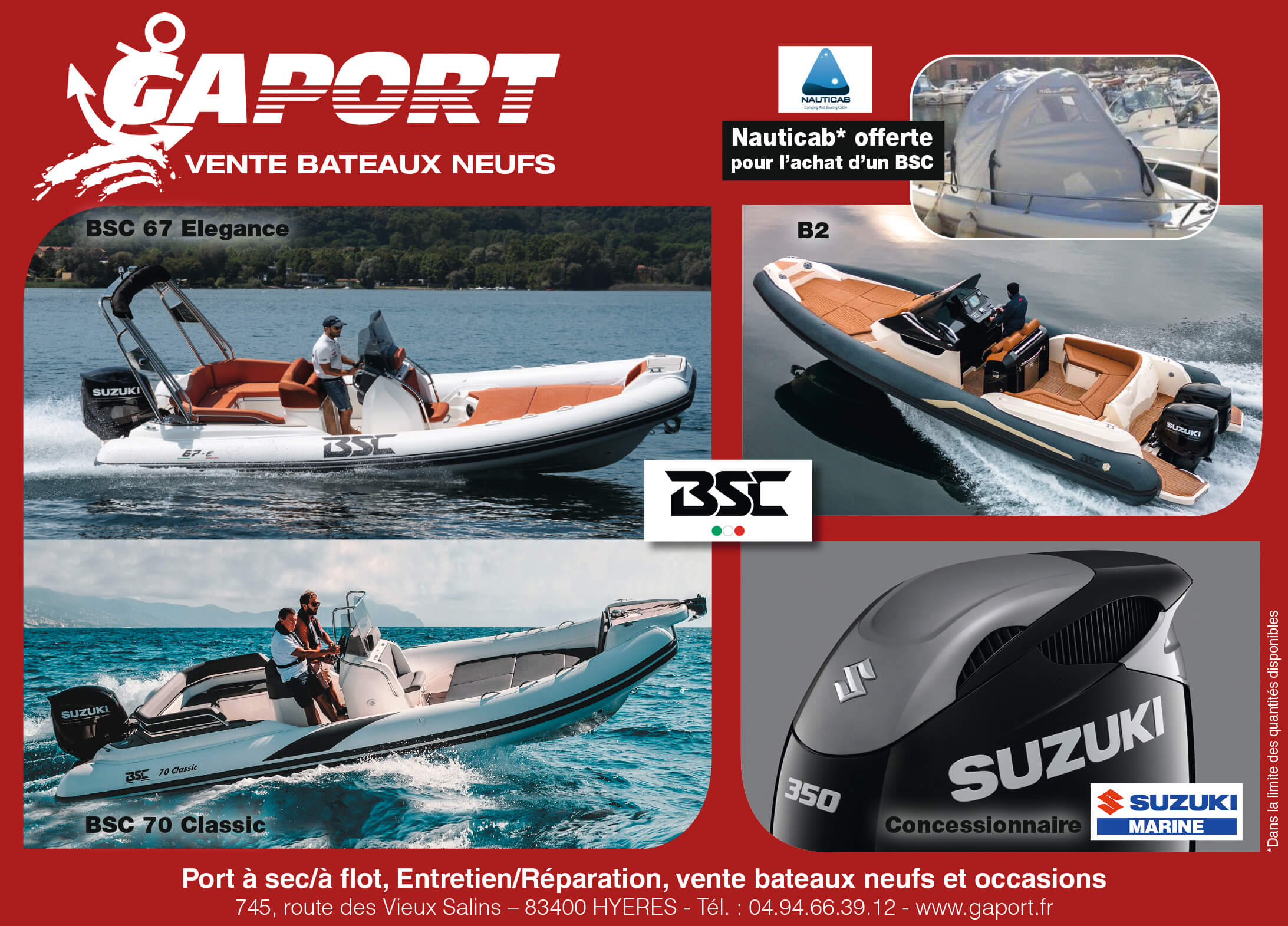 Notre cœur de métier : la plaisance. Des places de port, à la vente de bateaux neufs semi-rigides ou bateaux neufs à coque dure, Gaport est concessionnaire des marques BSC pour les bateaux semi-rigides, B2 Marine et Ranieri pour les bateaux à coque dure et de Suzuki Marine pour les moteurs, avec lesquels nos bateaux sont équipés. Vous pourrez également profiter de nos bateaux d’occasion. Gaport vous propose également des services d’entretien et de réparation de bateaux et de moteurs. Vous pouvez aussi vous rendre dans notre boutique d’accastillage pour y trouver des articles pour profiter pleinement de votre navigation. Enfin, Gaport est vendeur exclusif mondial de la Nauticab, la cabine de bateau amovible brevetée.